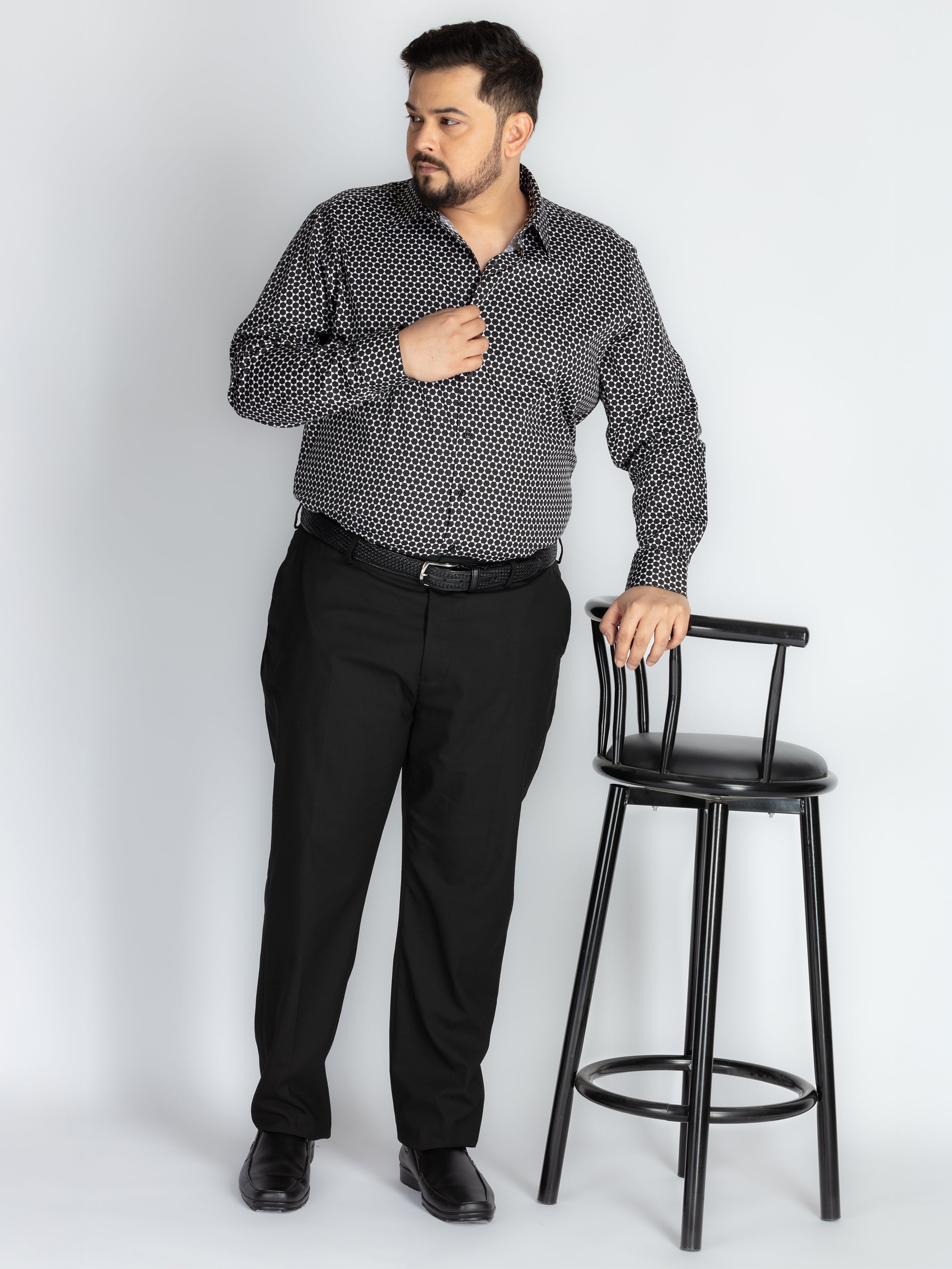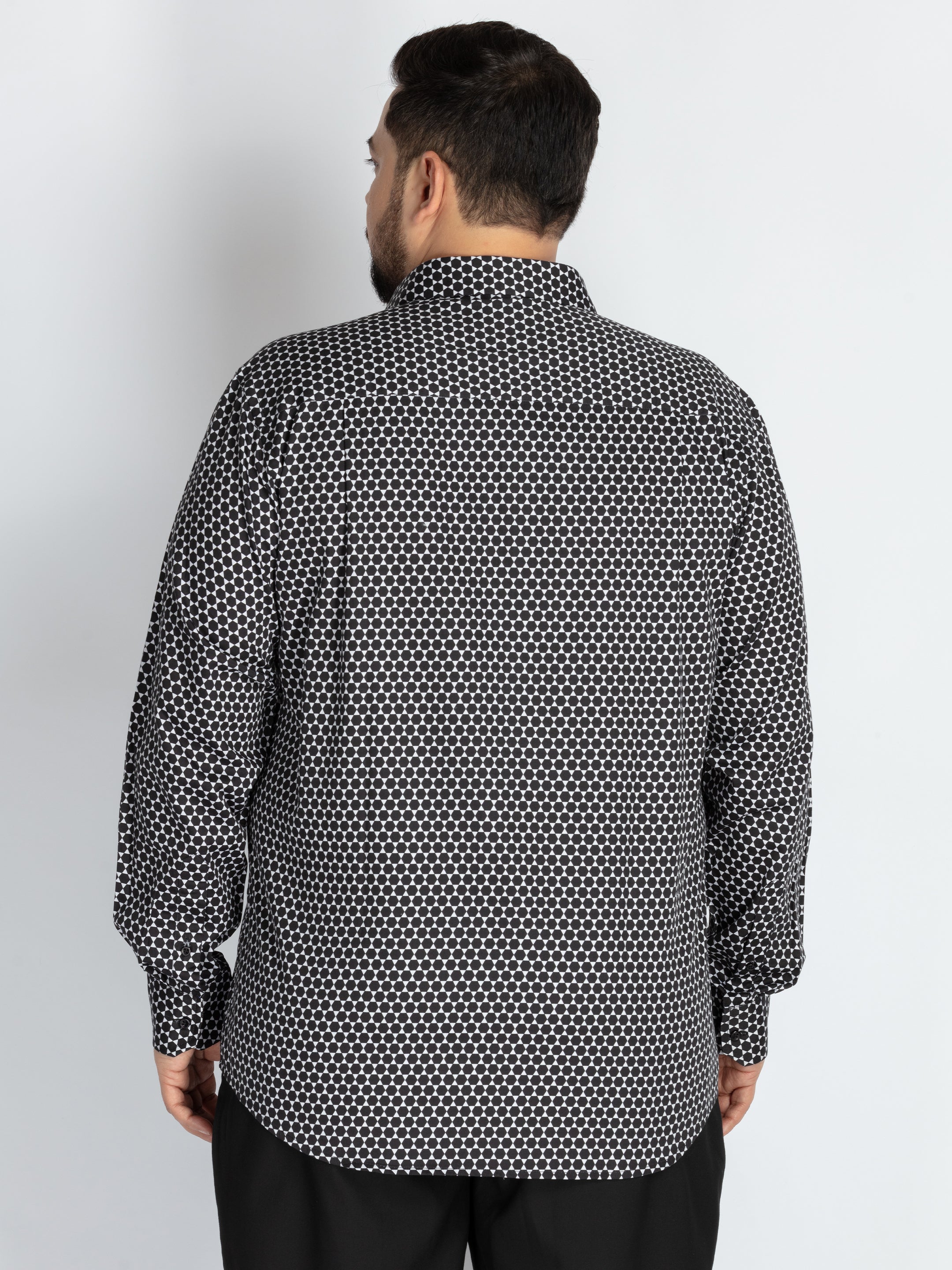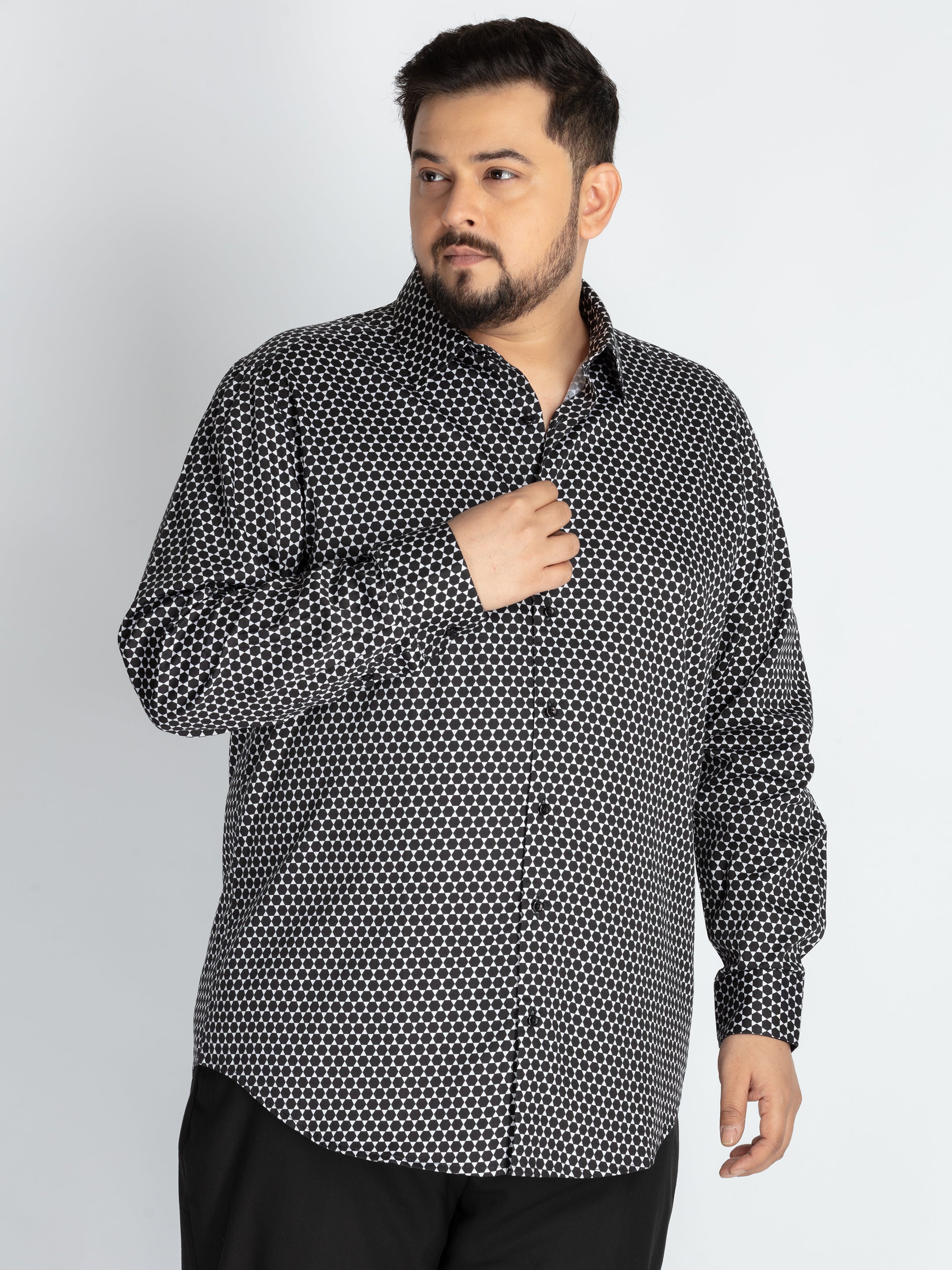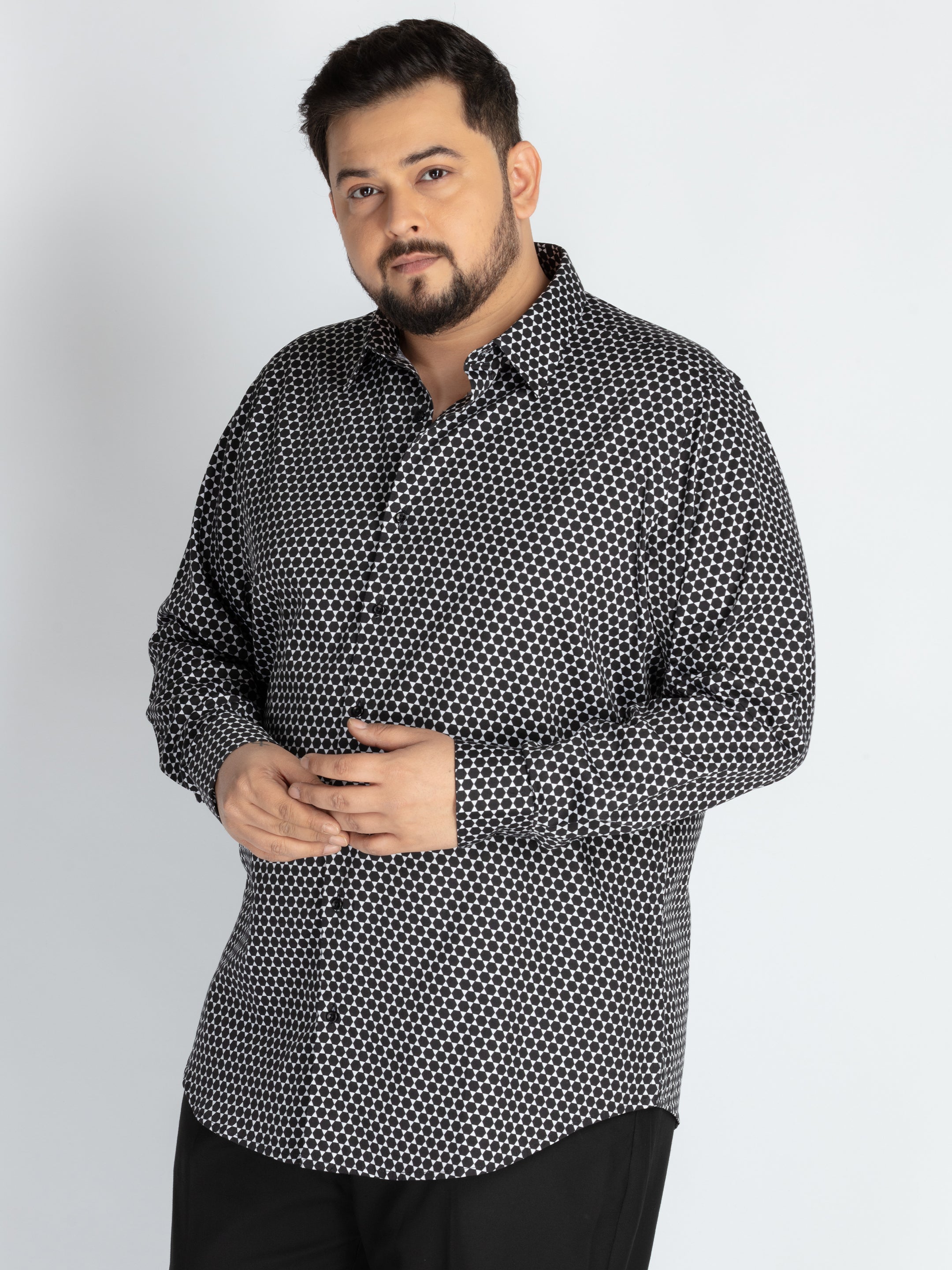 Make a bold statement with this stylish black and white geometric print shirt, tailored for the modern man. Featuring a crisp collar, full sleeves, and a button-down front, this shirt blends contemporary design with classic sophistication. Ideal for both office wear and evening outings, its breathable fabric ensures all-day comfort without compromising on style. Pair it with formal trousers or dark denim for a polished and confident look.