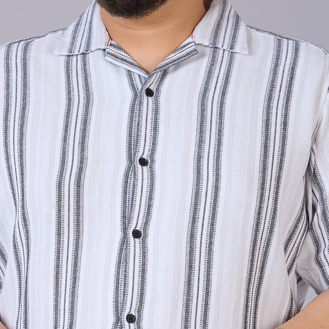 Refresh your warm-weather wardrobe with our Plus Size Men's White Dobby Stripe Shirt, a perfect blend of texture and comfort. Crafted from breathable 100% cotton, this shirt offers a distinctively softer hand feel and features a sophisticated Dobby Stripe weave that adds premium texture to the fabric. Designed for relaxed elegance, it boasts a trendy Cuban collar and half sleeves, making it the ultimate choice for a stylish casual outfit. Versatile and easy to style, it can be paired with Drawstring pants for a laid-back resort vibe, or teamed with Chinos or Denims for a sharp weekend look.