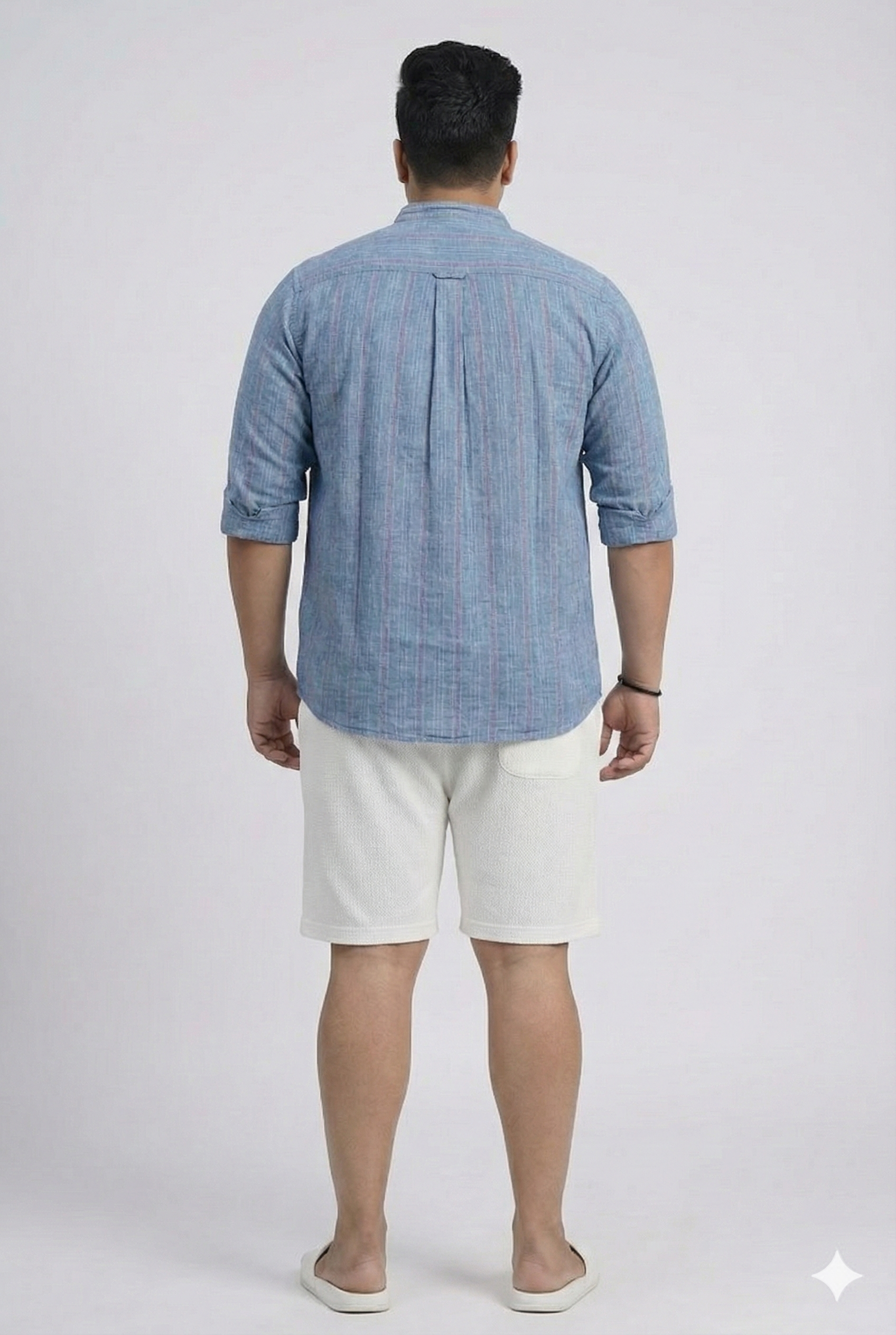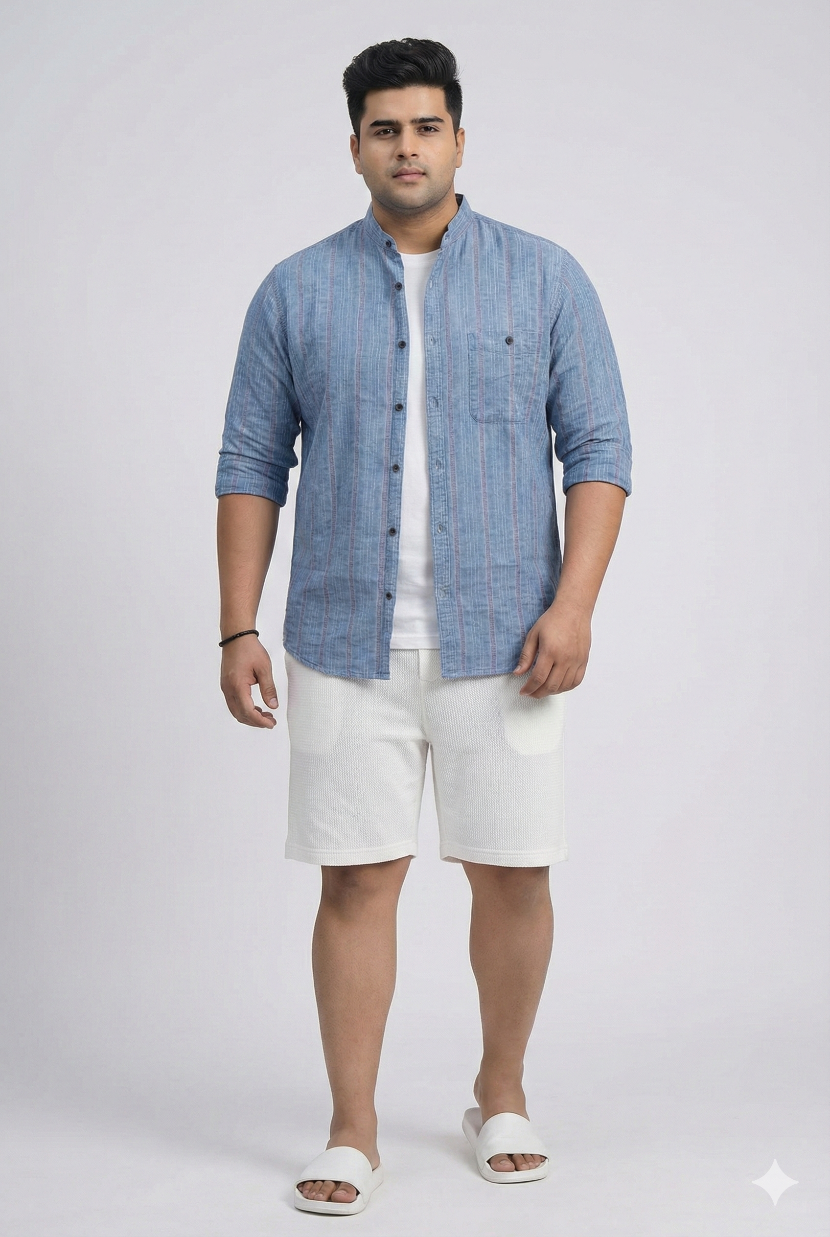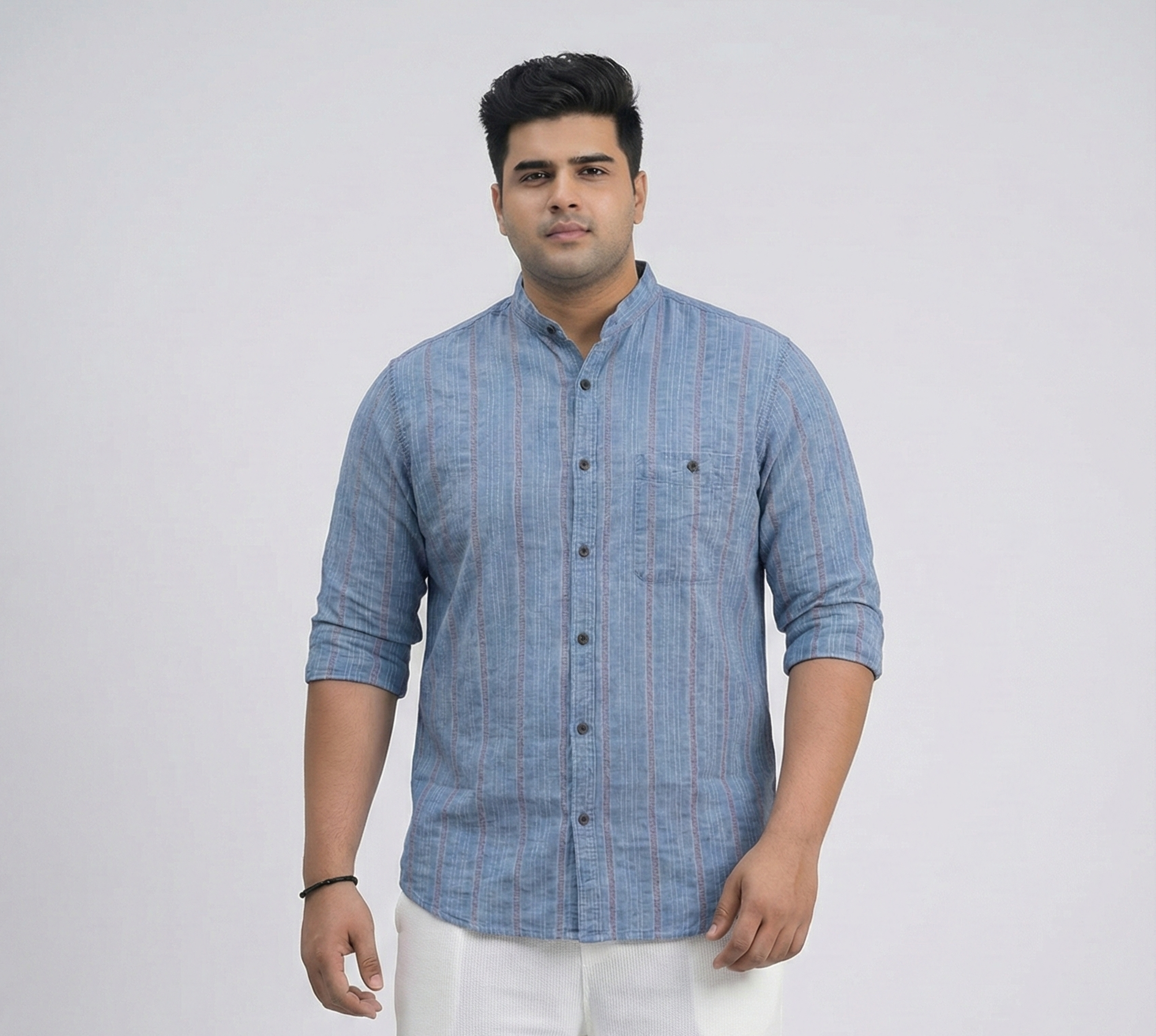 Embrace a relaxed, lived-in aesthetic with our Plus Size Men's Indigo Dobby Stripe Shirt. Crafted from premium 100% cotton, this piece features a textured Indigo Dobby Stripe pattern that exudes effortless style. We have treated this shirt with a specialized Ice Wash and Industrial wash, resulting in a distinct, vintage washed look and an exceptionally softer hand feel for maximum comfort. Detailed with a sleek Mandarin collar, this shirt is the ultimate versatile essential. Create a monochromatic look by pairing it with Indigo jeans, keep it smart with Chinos, or style it with White shorts which gives a holiday feel perfectly suited for vacations or sunny weekends.