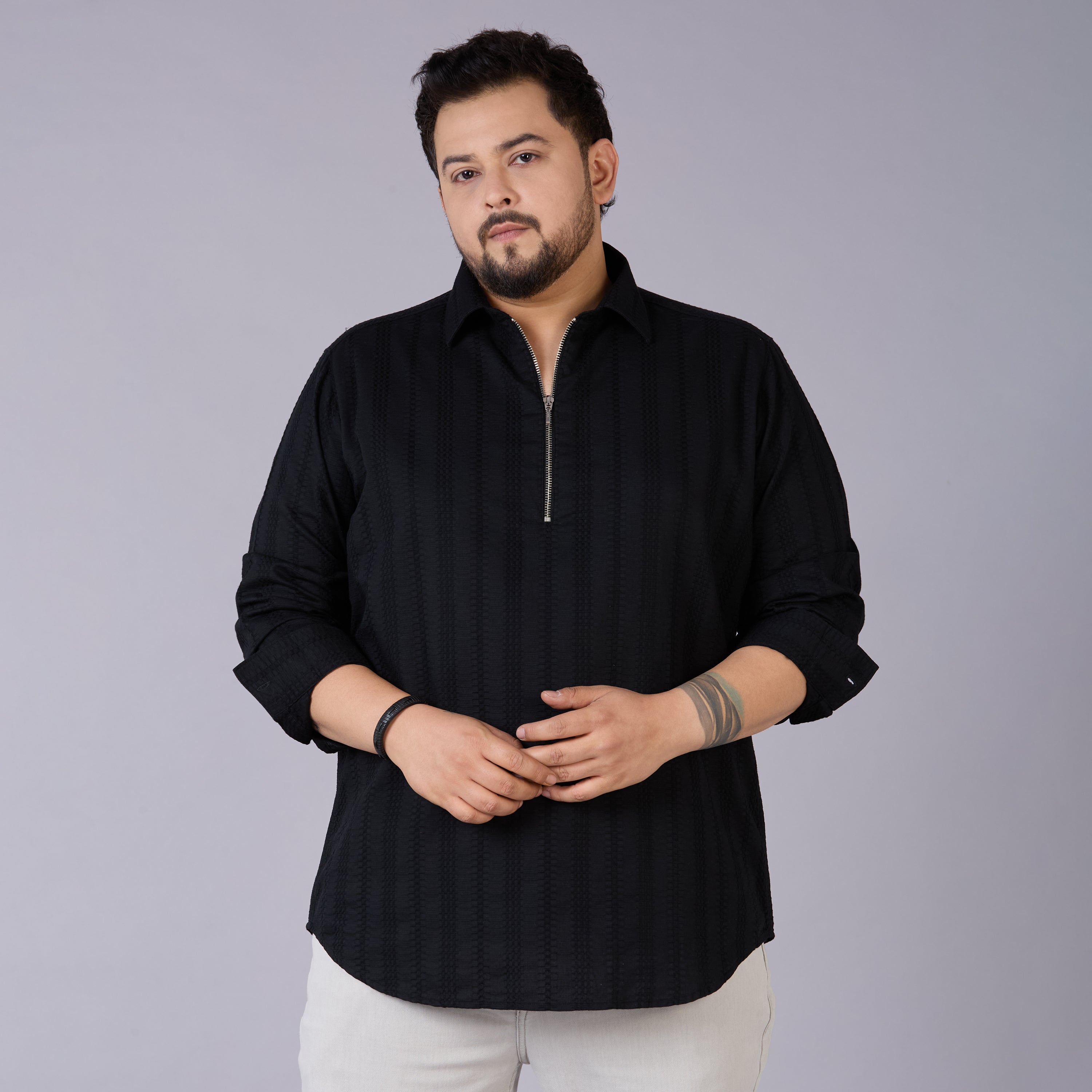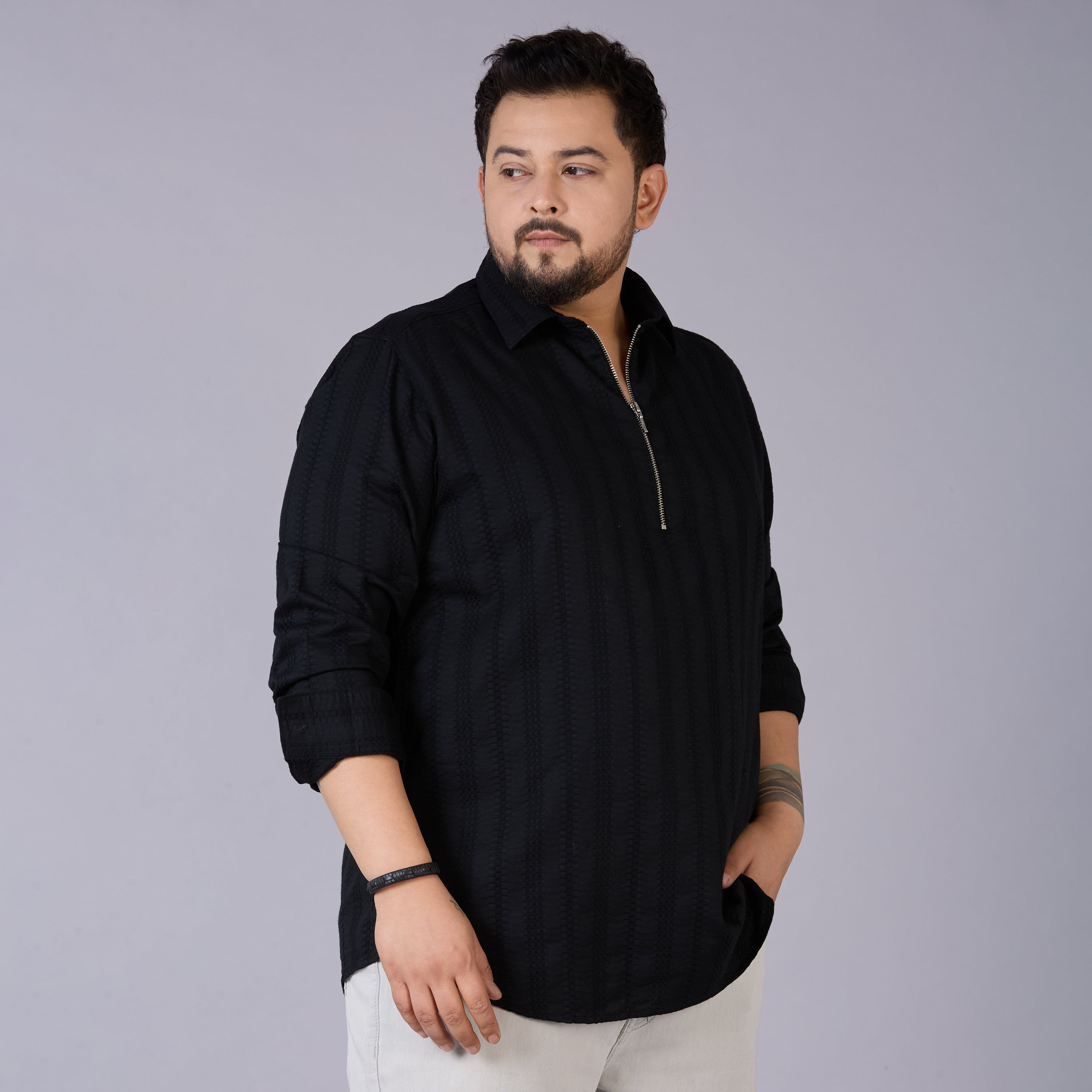 Upgrade your casual wardrobe with our Plus Size Men's Black Self-Structured Dobby Shirt, crafted from premium 100% cotton for a naturally soft hand feel. The subtle dobby texture adds a refined touch, while the sleek half-zipper and regular collar bring a modern edge to your look. Designed with full sleeves for versatile styling, this shirt is perfect for casual outings, evening dinners, or weekend plans. Style it effortlessly with jeans or chinos for a sharp, confident appearance.
