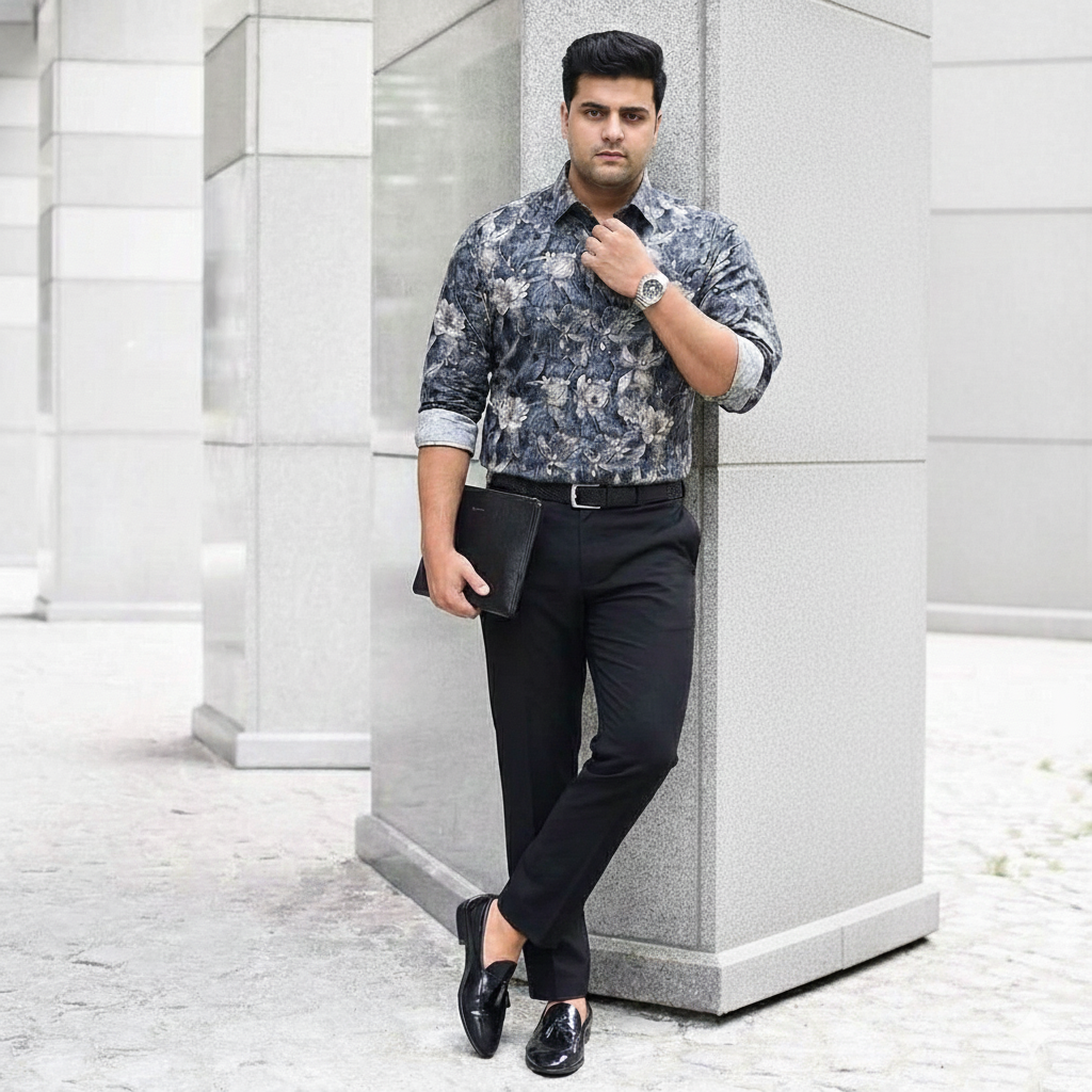 Plus Size Men's Navy Monochrome Floral Print Cotton Satin Shirt
