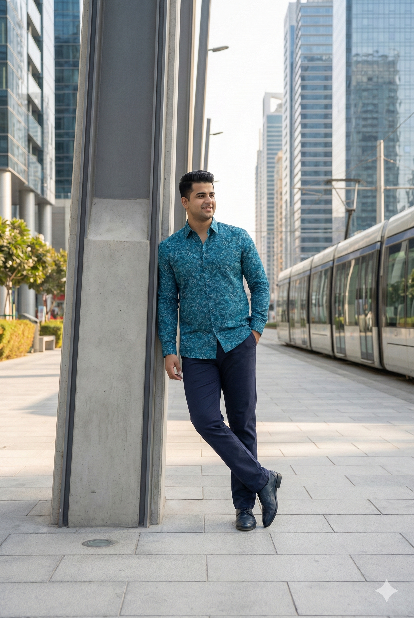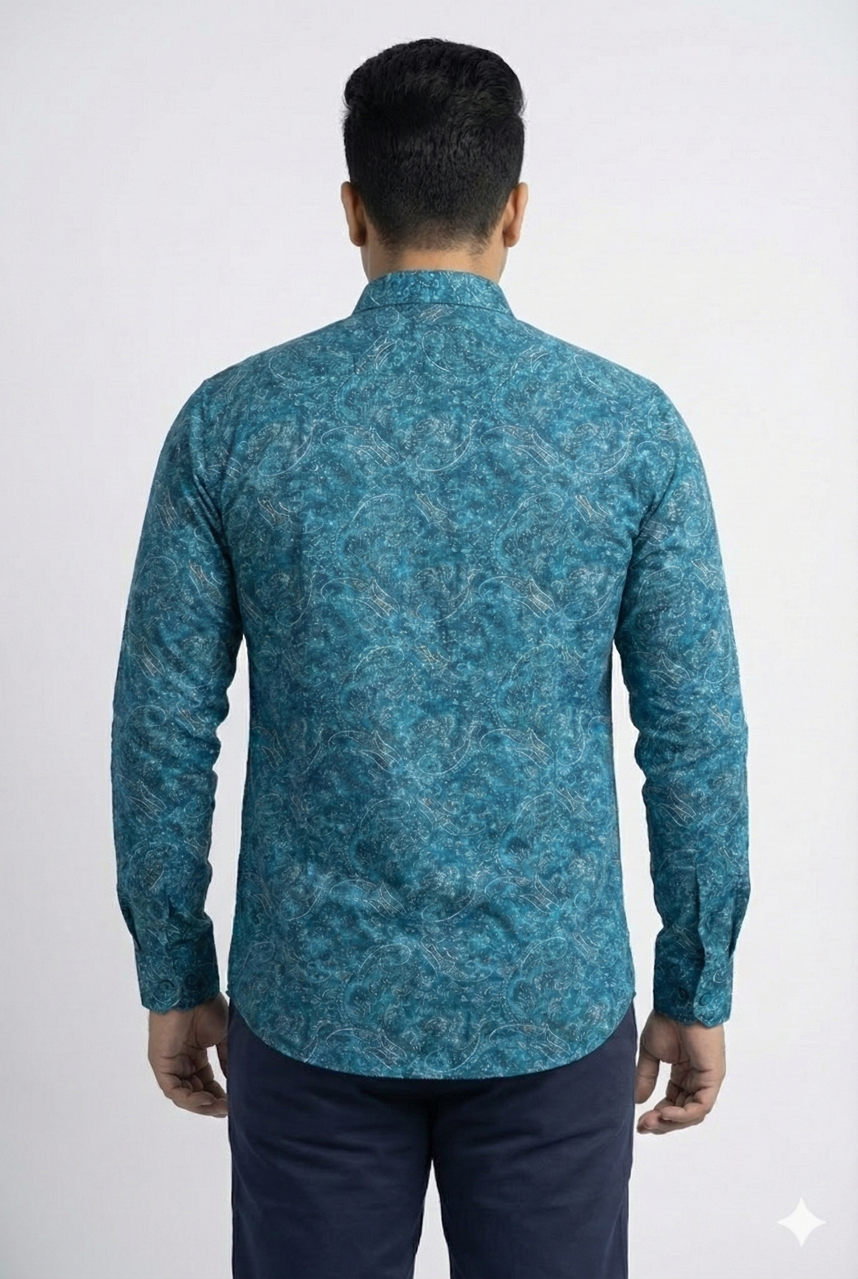 Define your evening aesthetic with the sophisticated edge of our Plus Size Men's Teal Green Paisley Shirt. This piece is expertly crafted from premium Printed Cotton Satin, delivering a luxurious luster and an exceptionally softer hand feel against the skin. The design showcases a rich, intricate all-over Paisley motif in deep shades of teal and green, creating a look that is both classic and captivating. Finished with a sharp regular spread collar, this shirt is the ultimate choice for distinct party wear and upscale evening wear. Pair it with black trousers for a sleek, formal appearance