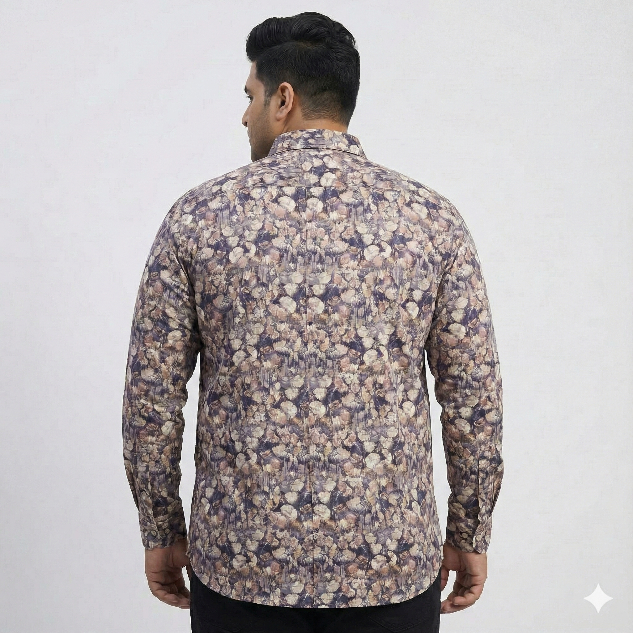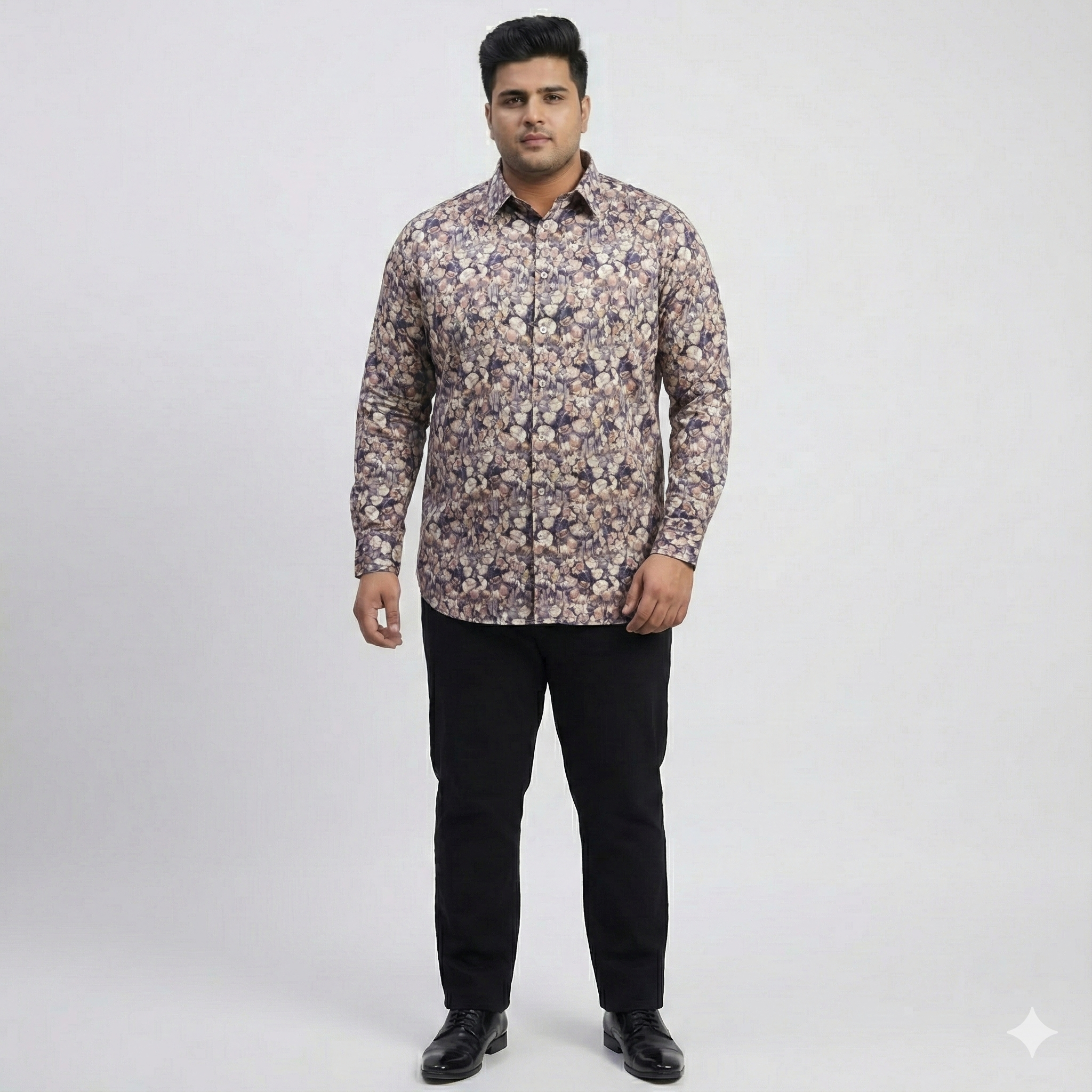 Elevate your evening attire with our Plus Size Men's Abstract Printed Shirt, a perfect fusion of artistic flair and sophisticated comfort. Expertly crafted from premium Printed Cotton Satin, this shirt offers a luxurious sheen and an incredibly softer hand feel. The design showcases a mesmerizing, painterly abstract print featuring overlapping petals and shapes in rich earthy tones of taupe, mocha, and slate grey. Finished with a classic regular spread collar, this distinctive piece is ideal for party wear and elegant evening wear. Style it with white trousers for a crisp, high-contrast look, or pair it with dark chinos for a refined night out.
